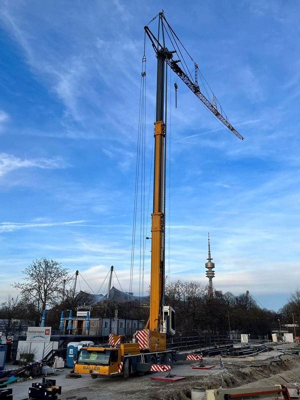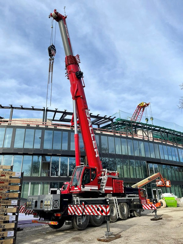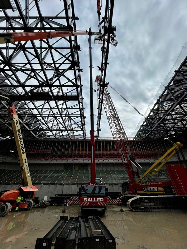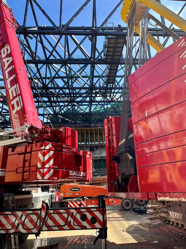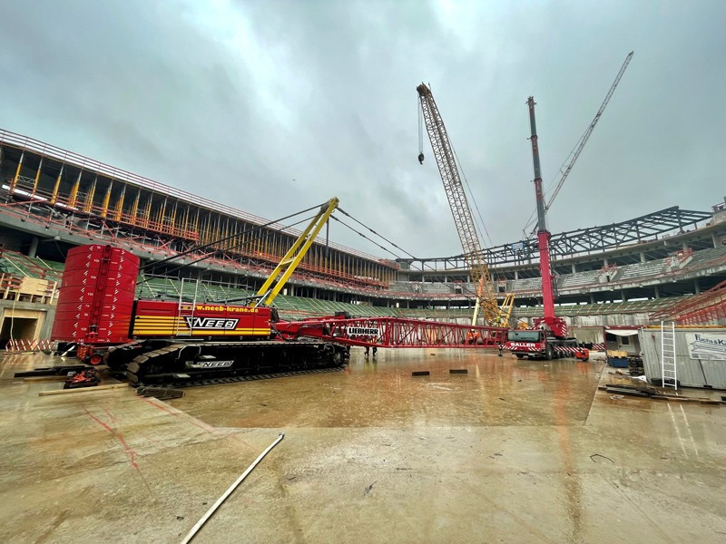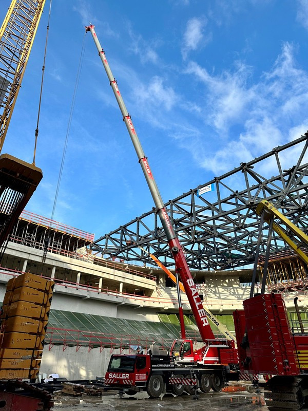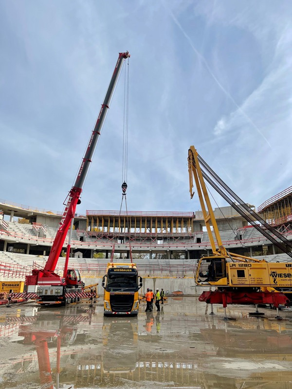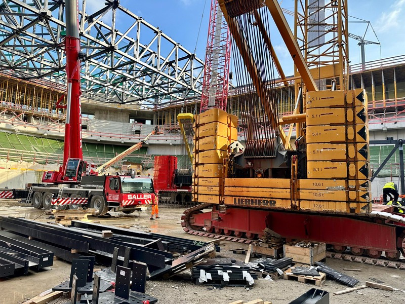 Die Bilder zeigen unsere Krane (2x LTM 1110-5.1, MK 140, LR 1280, LR 1300) die zum Teil über Monate für die Montage der Dachkonstruktion/Stahlbau eingesetzt wurden.