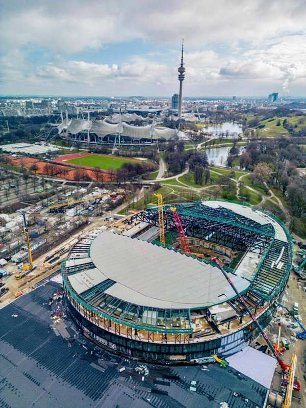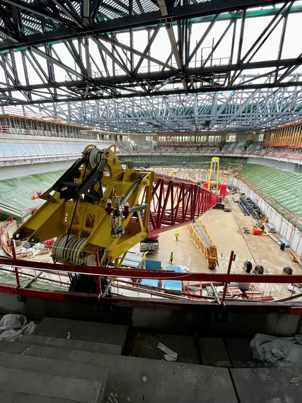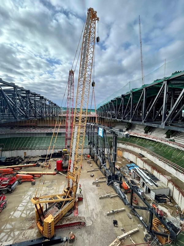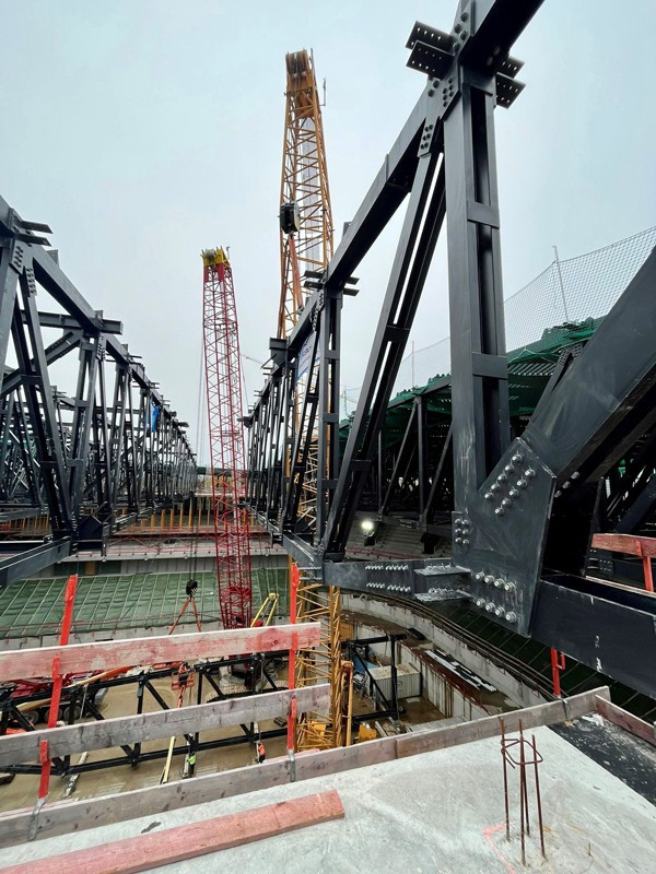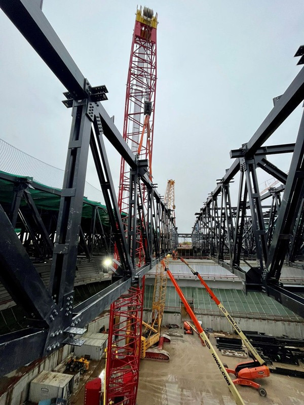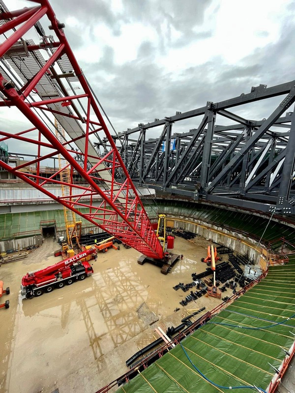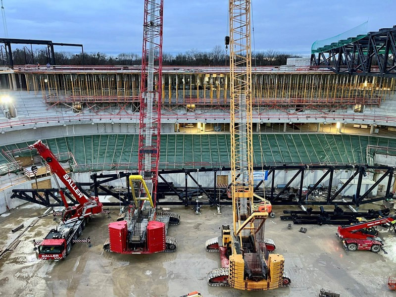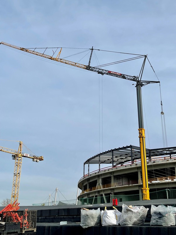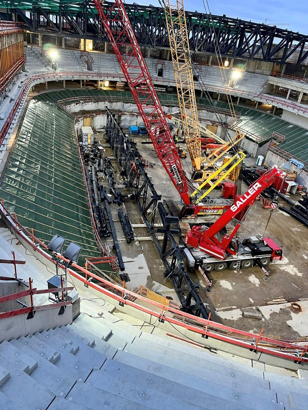 Die Bilder zeigen unsere Krane (2x LTM 1110-5.1, MK 140, LR 1280, LR 1300) die zum Teil über Monate für die Montage der Dachkonstruktion/Stahlbau eingesetzt wurden.