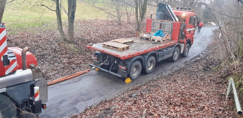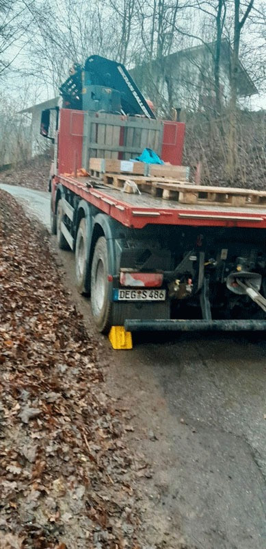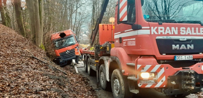 Im Februar 2025 musste unser Berge-Team einen festgefahrenen LKW aus einer sehr misslichen Lage befreien. Ein Lastwagen fuhr sich in einer steilen Zufahrtsstraße in einem Wohngebiet bei Deggendorf fest. Eingesetzt wurde unter anderem unser schweres LKW-Bergefahrzeug, ein LKW-Ladekran, sowie ein City-Spezialkran und diverses Bergequipment..