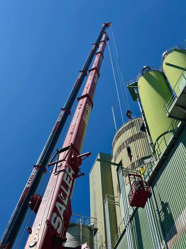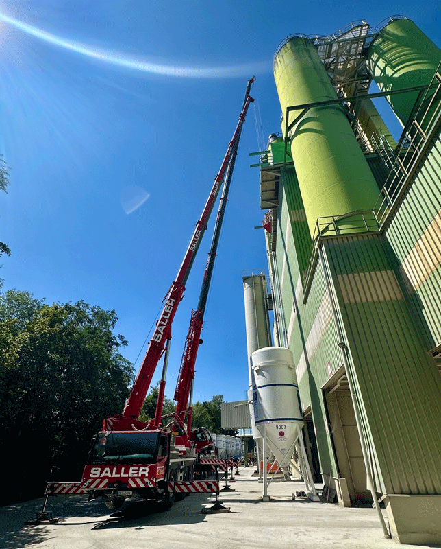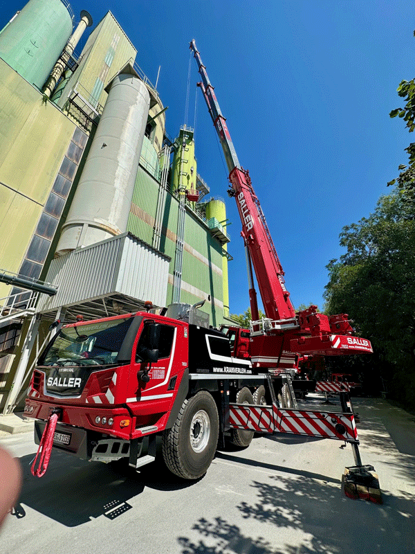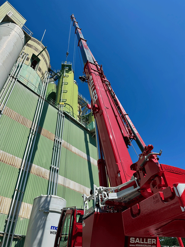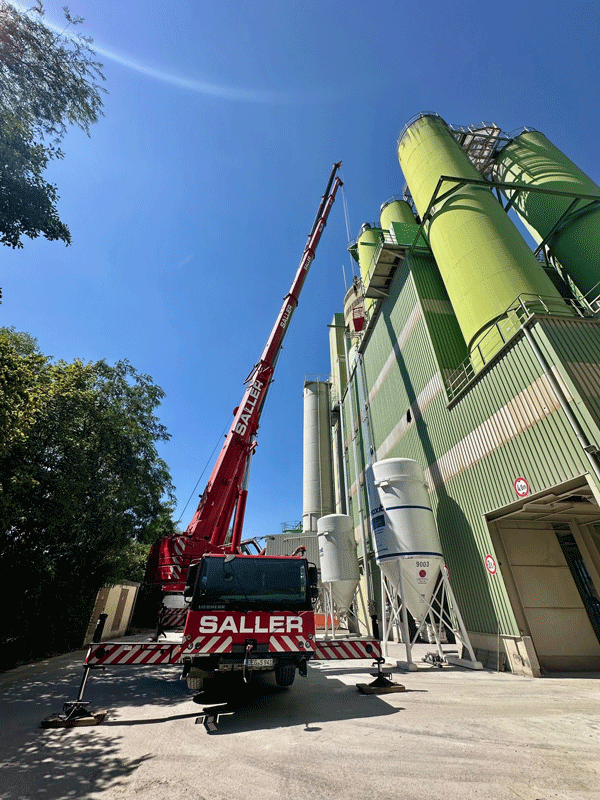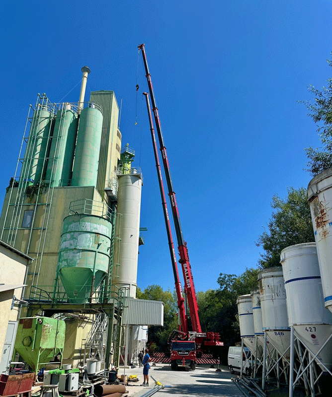 Unser neuer LTM 1100-5.3 kam bei Revisionsarbeiten in einem Zementwerk bei Plattling zum Einsatz. Dank dem langen Teleskopausleger von 62m, war keine Spitzenverlängerung am Hauptausleger notwendig. Unterstützt wurde der Kran von einem LTM 1060-3.1.