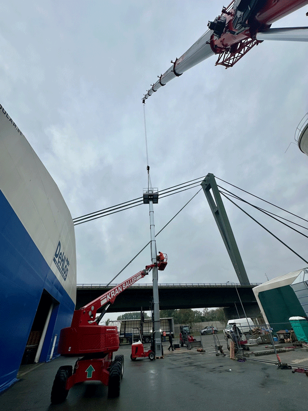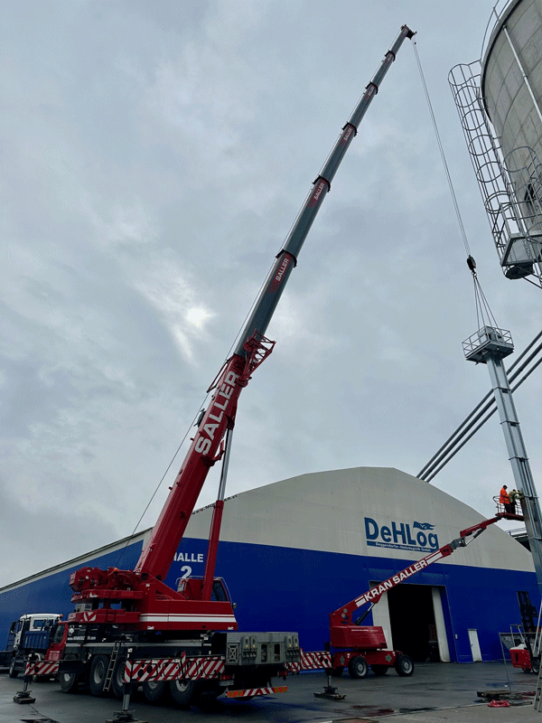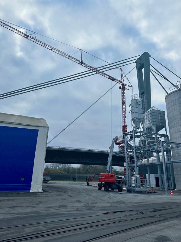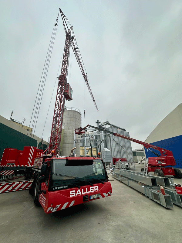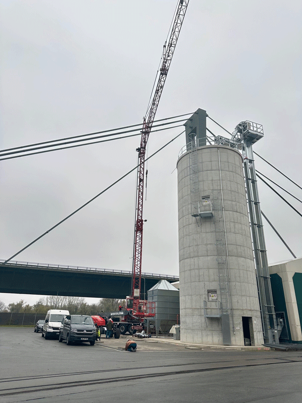 Eingesetzt wurden unter anderem ein Mobilbaukran MK 88 für die Stahlbauarbeiten, sowie eine 22m und 28m Teleskopbühne. Für das Einbringen der Elevatorkette wurde außerdem ein 110/120 Tonnen Kran eingesetzt. Wir möchten uns ausdrücklich bei unserem Auftraggeber für das entgegengebrachte Vertrauen bedanken.